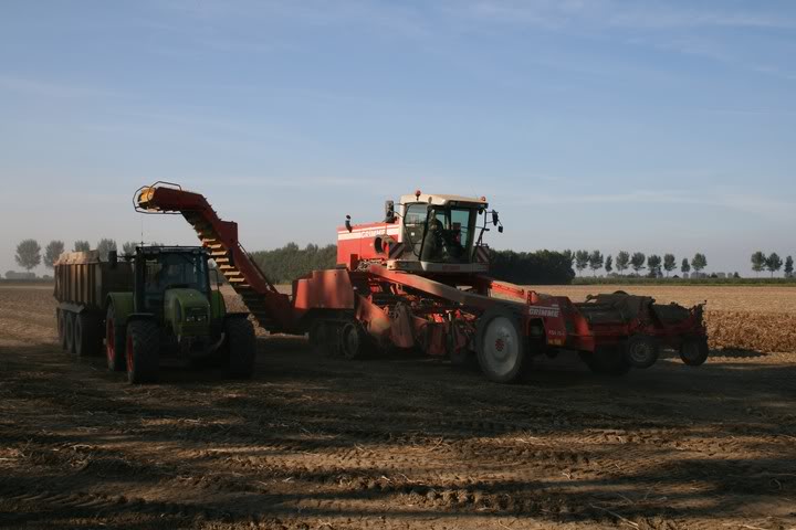 Aardappels rooien met een Grimme SF 3000 van loonbedrijf van der Sluijs uit Oude Tonge en een Claas Ares 696rz met een 3 assige Breston kipper.
