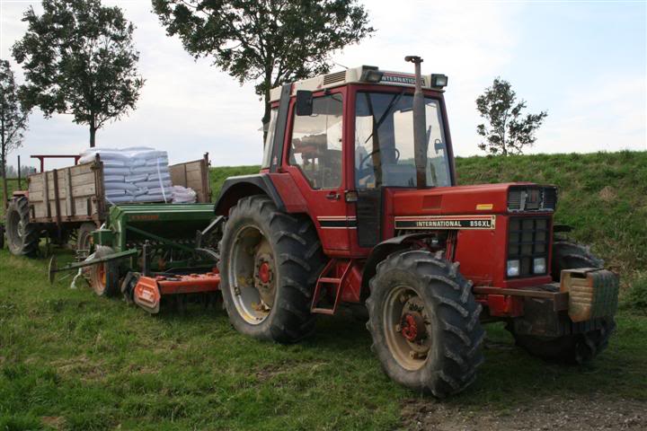 De International 856xl met Maschio kopeg en Amazone D7 Super-S zaaimachine staat te wachten om te kunnen gaan zaaien.