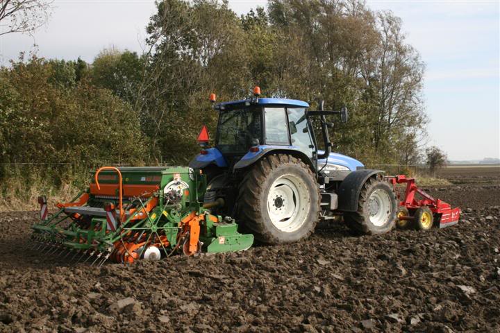 Wintertarwe zaaien met een New Holland TM 155 met Lely Lelyterra kopeg voorop en Amazone kopeg met AD 303 zaaimachine achter van akkerbouwer A.P Noordermeer uit Oudenhoorn.