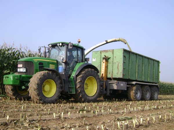 Het hakselen gebeurde met een Claas Jaguar 900 met Orbis maïsbek. Onder de pijp een JD 6920 met Dewa silagewagen.