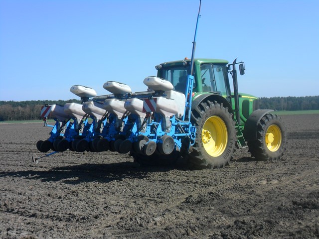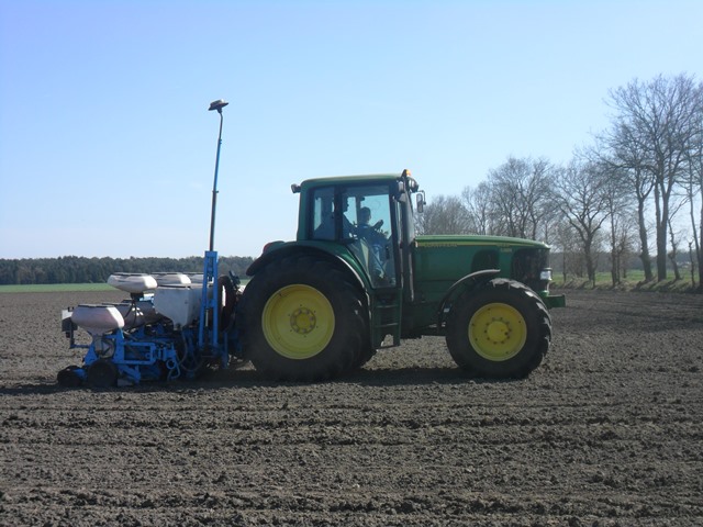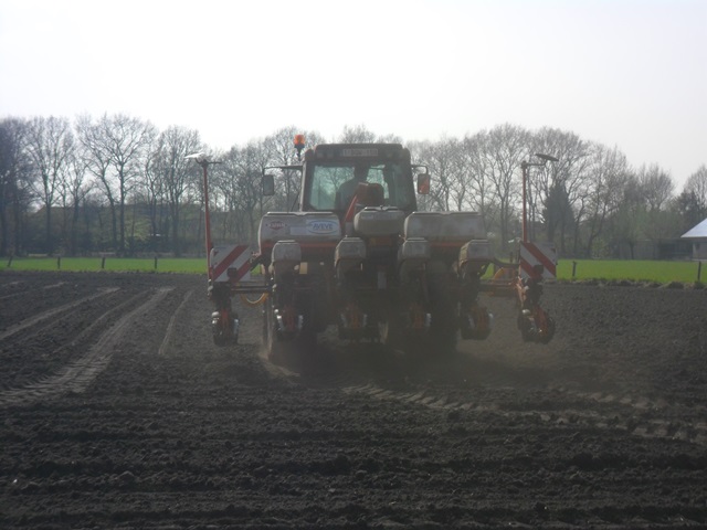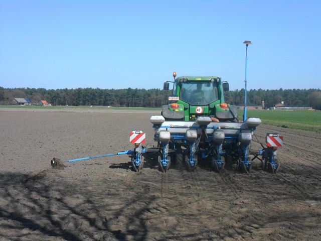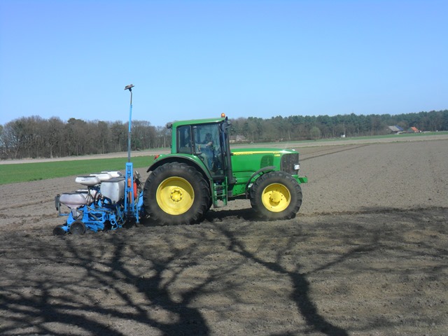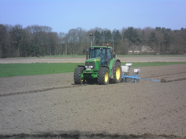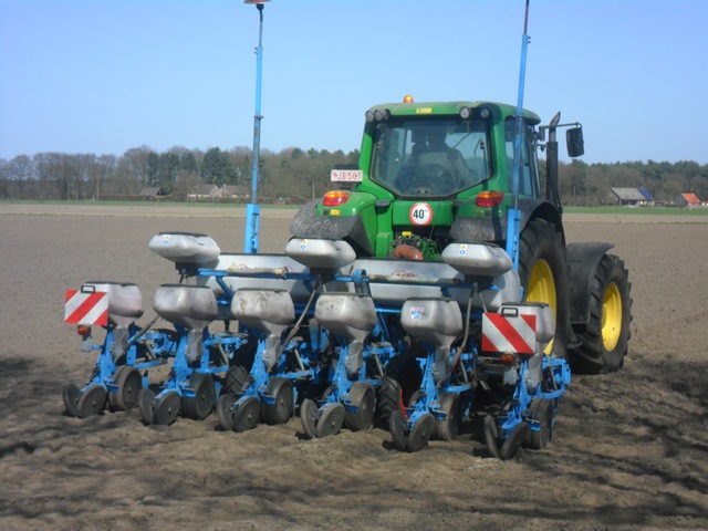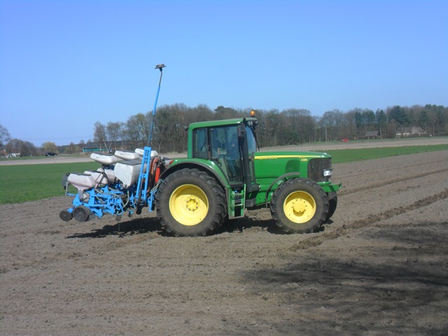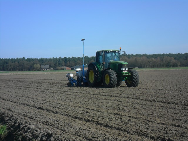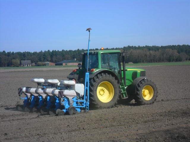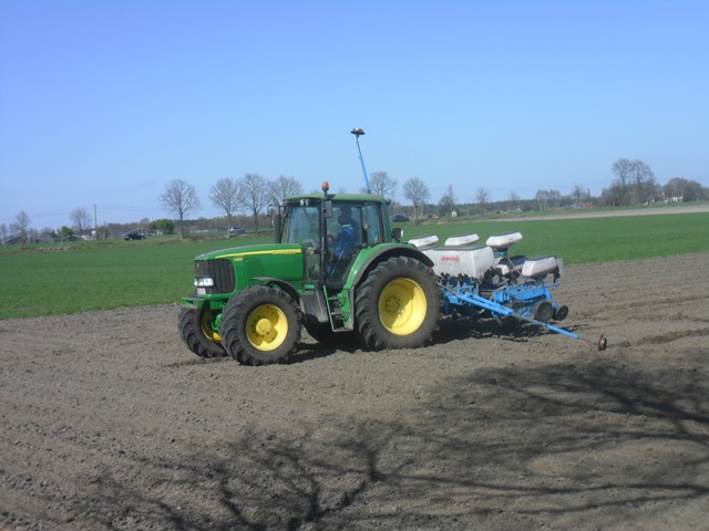 John Deere 6620 met een zesrijïge Monosem maïszaaimachine van Joris Peeters uit Essen.