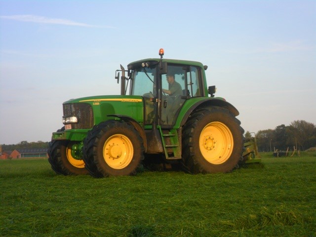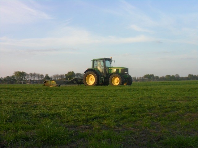 De JD 6620 van Peeters aan het maaien met een Krone maaier.